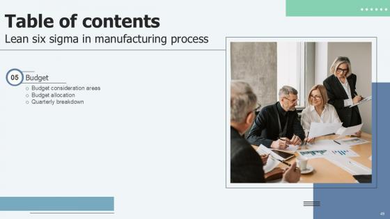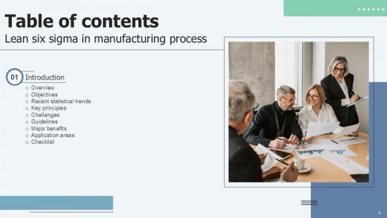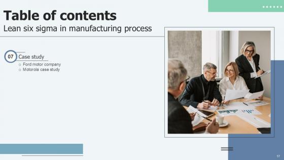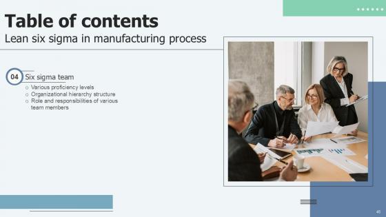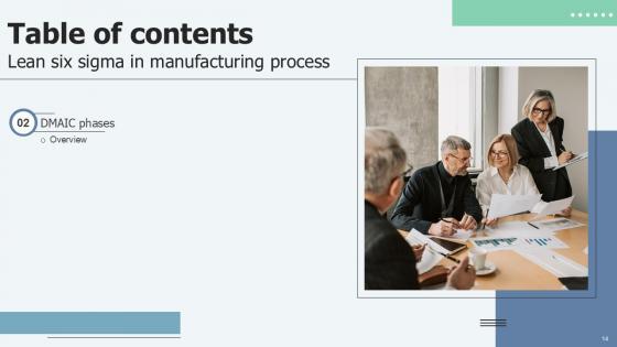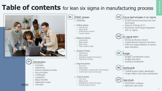 Coming up with a presentation necessitates that the majority of the effort goes into the content and the message you intend to convey. The visuals of a PowerPoint presentation can only be effective if it supplements and supports the story that is being told. Keeping this in mind our experts created Table Of Contents Lean Six Sigma In Manufacturing Process Ppt Example to reduce the time that goes into designing the presentation. This way, you can concentrate on the message while our designers take care of providing you with the right template for the situation. Our Table Of Contents Lean Six Sigma In Manufacturing Process Ppt Example are topically designed to provide an attractive backdrop to any subject. Use them to look like a presentation pro.