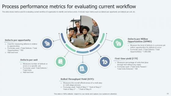 This slide shows metrics used for evaluating current workflow of organization to identify and remove errors. It include major metrics such as defects per opportunity and defects per unit, etc. Present like a pro with Process Performance Metrics For Lean Six Sigma In Manufacturing Ppt Sample. Create beautiful presentations together with your team, using our easy-to-use presentation slides. Share your ideas in real-time and make changes on the fly by downloading our templates. So whether you are in the office, on the go, or in a remote location, you can stay in sync with your team and present your ideas with confidence. With Slidegeeks presentation got a whole lot easier. Grab these presentations today. This slide shows metrics used for evaluating current workflow of organization to identify and remove errors. It include major metrics such as defects per opportunity and defects per unit, etc.