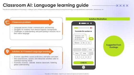 This slide showcases classroom AI technology i.e. multilingual guide, referable for teachers and students wanting to leverage this technology. It provides details about communication, interactive quiz, etc. Welcome to our selection of the Classroom AI Language Learning Guide Educational Transformation Through AI SS V. These are designed to help you showcase your creativity and bring your sphere to life. Planning and Innovation are essential for any business that is just starting out. This collection contains the designs that you need for your everyday presentations. All of our PowerPoints are 100Percent editable, so you can customize them to suit your needs. This multi-purpose template can be used in various situations. Grab these presentation templates today. This slide showcases classroom AI technology i.e. multilingual guide, referable for teachers and students wanting to leverage this technology. It provides details about communication, interactive quiz, etc.