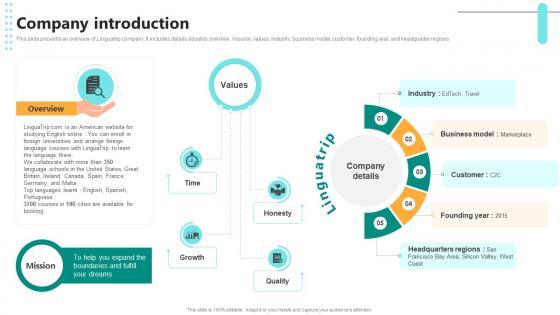 This slide presents an overview of Linguatrip company. It includes details about its overview, mission, values, industry, business model, customer, founding year, and headquarter regions. Create an editable Company Introduction Digital Language Learning Solution Pitch Deck that communicates your idea and engages your audience. Whether you are presenting a business or an educational presentation, pre-designed presentation templates help save time. Company Introduction Digital Language Learning Solution Pitch Deck is highly customizable and very easy to edit, covering many different styles from creative to business presentations. Slidegeeks has creative team members who have crafted amazing templates. So, go and get them without any delay. This slide presents an overview of Linguatrip company. It includes details about its overview, mission, values, industry, business model, customer, founding year, and headquarter regions.