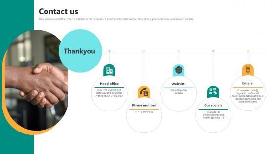 This slide presents the contact us details of the company. It provides information about its address, phone number, website and socials. Want to ace your presentation in front of a live audience Our Contact Us Digital Language Learning Solution Pitch Deck can help you do that by engaging all the users towards you. Slidegeeks experts have put their efforts and expertise into creating these impeccable powerpoint presentations so that you can communicate your ideas clearly. Moreover, all the templates are customizable, and easy-to-edit and downloadable. Use these for both personal and commercial use. This slide presents the contact us details of the company. It provides information about its address, phone number, website and socials.