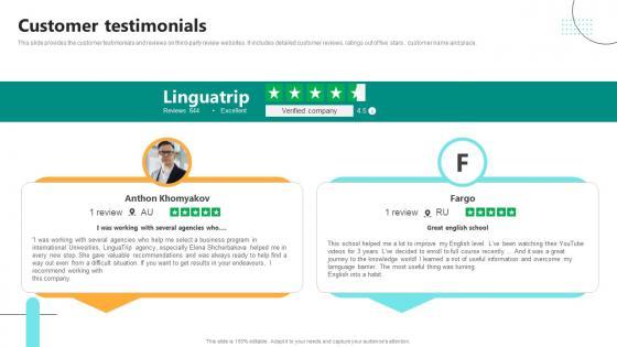 This slide provides the customer testimonials and reviews on third-party review websites. It includes detailed customer reviews, ratings out of five stars , customer name and place. Do you have to make sure that everyone on your team knows about any specific topic I yes, then you should give Customer Testimonials Digital Language Learning Solution Pitch Deck a try. Our experts have put a lot of knowledge and effort into creating this impeccable Customer Testimonials Digital Language Learning Solution Pitch Deck. You can use this template for your upcoming presentations, as the slides are perfect to represent even the tiniest detail. You can download these templates from the Slidegeeks website and these are easy to edit. So grab these today This slide provides the customer testimonials and reviews on third-party review websites. It includes detailed customer reviews, ratings out of five stars , customer name and place.