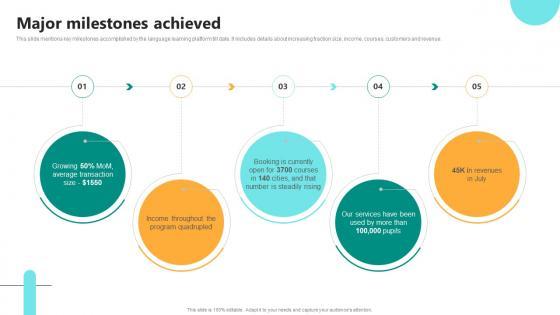 This slide mentions key milestones accomplished by the language learning platform till date. It includes details about increasing traction size, income, courses, customers and revenue. If you are looking for a format to display your unique thoughts, then the professionally designed Major Milestones Achieved Digital Language Learning Solution Pitch Deck is the one for you. You can use it as a Google Slides template or a PowerPoint template. Incorporate impressive visuals, symbols, images, and other charts. Modify or reorganize the text boxes as you desire. Experiment with shade schemes and font pairings. Alter, share or cooperate with other people on your work. Download Major Milestones Achieved Digital Language Learning Solution Pitch Deck and find out how to give a successful presentation. Present a perfect display to your team and make your presentation unforgettable. This slide mentions key milestones accomplished by the language learning platform till date. It includes details about increasing traction size, income, courses, customers and revenue.