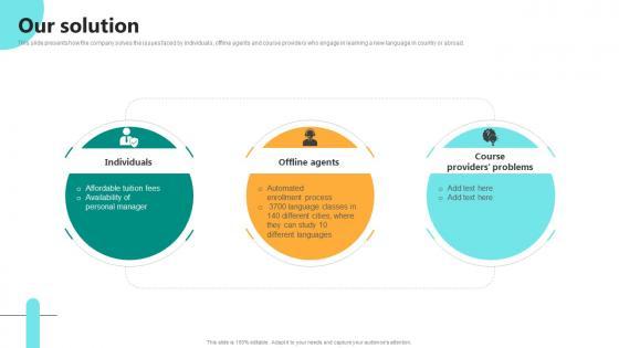This slide presents how the company solves the issues faced by individuals, offline agents and course providers who engage in learning a new language in country or abroad. Make sure to capture your audiences attention in your business displays with our gratis customizable Our Solution Digital Language Learning Solution Pitch Deck. These are great for business strategies, office conferences, capital raising or task suggestions. If you desire to acquire more customers for your tech business and ensure they stay satisfied, create your own sales presentation with these plain slides. This slide presents how the company solves the issues faced by individuals, offline agents and course providers who engage in learning a new language in country or abroad.