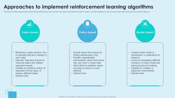 This slide showcases 3 approaches of reinforcement based learning which can help AI developers understand and build ML models. It provides details about value, policy and model based along with environments, states, etc. Find highly impressive Reinforcement Learning Unveiled Approaches To Implement Reinforcement Learning AI SS V on Slidegeeks to deliver a meaningful presentation. You can save an ample amount of time using these presentation templates. No need to worry to prepare everything from scratch because Slidegeeks experts have already done a huge research and work for you. You need to download Reinforcement Learning Unveiled Approaches To Implement Reinforcement Learning AI SS V for your upcoming presentation. All the presentation templates are 100 percent editable and you can change the color and personalize the content accordingly. Download now This slide showcases 3 approaches of reinforcement based learning which can help AI developers understand and build ML models. It provides details about value, policy and model based along with environments, states, etc.