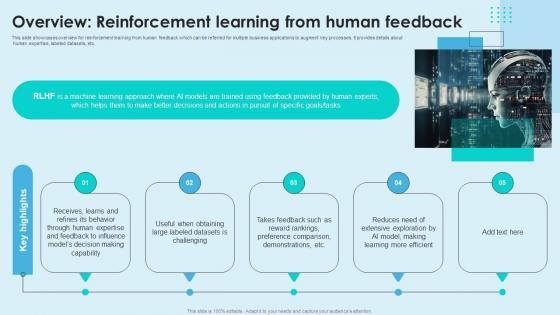This slide showcases overview for reinforcement learning from human feedback which can be referred for multiple business applications to augment key processes. It provides details about human expertise, labeled datasets, etc. Slidegeeks has constructed Reinforcement Learning Unveiled Overview Reinforcement Learning From Human Feedback AI SS V after conducting extensive research and examination. These presentation templates are constantly being generated and modified based on user preferences and critiques from editors. Here, you will find the most attractive templates for a range of purposes while taking into account ratings and remarks from users regarding the content. This is an excellent jumping-off point to explore our content and will give new users an insight into our top-notch PowerPoint Templates. This slide showcases overview for reinforcement learning from human feedback which can be referred for multiple business applications to augment key processes. It provides details about human expertise, labeled datasets, etc.