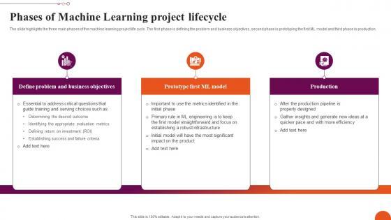 The slide highlights the three main phases of the machine learning project life cycle. The first phase is defining the problem and business objectives, second phase is prototyping the first ML model and third phase is production. The best PPT templates are a great way to save time, energy, and resources. Slidegeeks have 100 percent editable powerpoint slides making them incredibly versatile. With these quality presentation templates, you can create a captivating and memorable presentation by combining visually appealing slides and effectively communicating your message. Download Phases Of Machine Learning Project Lifecycle Exploring Machine Learning Operations Mockup Pdf from Slidegeeks and deliver a wonderful presentation. The slide highlights the three main phases of the machine learning project life cycle. The first phase is defining the problem and business objectives, second phase is prototyping the first ML model and third phase is production.