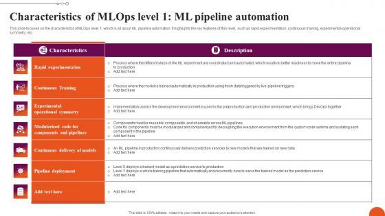 This slide focuses on the characteristics of MLOps level 1, which is all about ML pipeline automation. It highlights the key features of this level, such as rapid experimentation, continuous training, experimental operational symmetry, etc. This Characteristics Of MLOps Level 1 ML Pipeline Exploring Machine Learning Operations Download Pdf from Slidegeeks makes it easy to present information on your topic with precision. It provides customization options, so you can make changes to the colors, design, graphics, or any other component to create a unique layout. It is also available for immediate download, so you can begin using it right away. Slidegeeks has done good research to ensure that you have everything you need to make your presentation stand out. Make a name out there for a brilliant performance. This slide focuses on the characteristics of MLOps level 1, which is all about ML pipeline automation. It highlights the key features of this level, such as rapid experimentation, continuous training, experimental operational symmetry, etc.