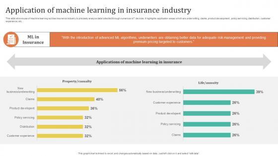 This slide shows use of machine learning across insurance industry to precisely analyze data collected through numerous IoT devices. It highlights application areas which are underwriting, claims, product development, policy servicing, distribution, customer experience, etc. Get a simple yet stunning designed Improving Customer Satisfaction Application Of Machine Learning In Insurance Industry. It is the best one to establish the tone in your meetings. It is an excellent way to make your presentations highly effective. So, download this PPT today from Slidegeeks and see the positive impacts. Our easy-to-edit Improving Customer Satisfaction Application Of Machine Learning In Insurance Industry can be your go-to option for all upcoming conferences and meetings. So, what are you waiting for Grab this template today. This slide shows use of machine learning across insurance industry to precisely analyze data collected through numerous IoT devices. It highlights application areas which are underwriting, claims, product development, policy servicing, distribution, customer experience, etc.
