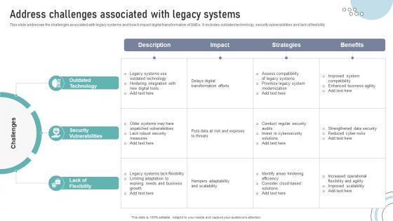 This slide addresses the challenges associated with legacy systems and how it impact digital transformation of SMEs. It includes outdated technology, security vulnerabilities and lack of flexibility.Find a pre-designed and impeccable Address Challenges Associated With Legacy Systems DT SS V. The templates can ace your presentation without additional effort. You can download these easy-to-edit presentation templates to make your presentation stand out from others. So, what are you waiting for Download the template from Slidegeeks today and give a unique touch to your presentation. This slide addresses the challenges associated with legacy systems and how it impact digital transformation of SMEs. It includes outdated technology, security vulnerabilities and lack of flexibility.