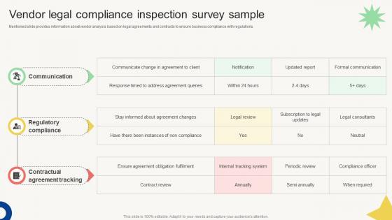Mentioned slide provides information about vendor analysis based on legal agreements and contracts to ensure business compliance with regulations. Boost your pitch with our creative Vendor Management Audit Vendor Legal Compliance Inspection Survey Sample. Deliver an awe-inspiring pitch that will mesmerize everyone. Using these presentation templates you will surely catch everyones attention. You can browse the ppts collection on our website. We have researchers who are experts at creating the right content for the templates. So you do not have to invest time in any additional work. Just grab the template now and use them. Mentioned slide provides information about vendor analysis based on legal agreements and contracts to ensure business compliance with regulations.