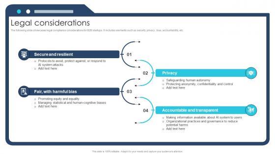 The following slide showcases legal compliance considerations for B2B startups. It includes elements such as security, privacy, bias, accountability, etc.If your project calls for a presentation, then Slidegeeks is your go-to partner because we have professionally designed, easy-to-edit templates that are perfect for any presentation. After downloading, you can easily edit Legal Considerations Ai Chatbot Service Market Entry Strategy and make the changes accordingly. You can rearrange slides or fill them with different images. Check out all the handy templates The following slide showcases legal compliance considerations for B2B startups. It includes elements such as security, privacy, bias, accountability, etc.