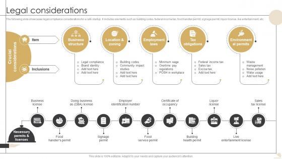The following slide showcases legal compliance considerations for a cafe startup. It includes elements such as building codes, federal income tax, food handler permit, signage permit, liquor license, live entertainment, etc.Slidegeeks is one of the best resources for PowerPoint templates. You can download easily and regulate Legal Considerations Coffee Bar Go To Market Strategy GTM SS V for your personal presentations from our wonderful collection. A few clicks is all it takes to discover and get the most relevant and appropriate templates. Use our Templates to add a unique zing and appeal to your presentation and meetings. All the slides are easy to edit and you can use them even for advertisement purposes. The following slide showcases legal compliance considerations for a cafe startup. It includes elements such as building codes, federal income tax, food handler permit, signage permit, liquor license, live entertainment, etc.