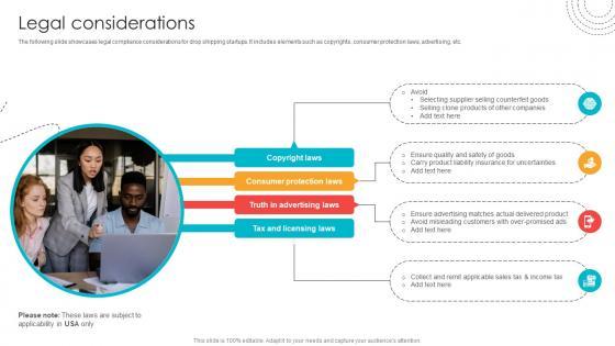 The following slide showcases legal compliance considerations for drop shipping startups. It includes elements such as copyrights, consumer protection laws, advertising, etc.If your project calls for a presentation, then Slidegeeks is your go-to partner because we have professionally designed, easy-to-edit templates that are perfect for any presentation. After downloading, you can easily edit Legal Considerations Blind Shipping GTM Strategy GTM SS V and make the changes accordingly. You can rearrange slides or fill them with different images. Check out all the handy templates The following slide showcases legal compliance considerations for drop shipping startups. It includes elements such as copyrights, consumer protection laws, advertising, etc.