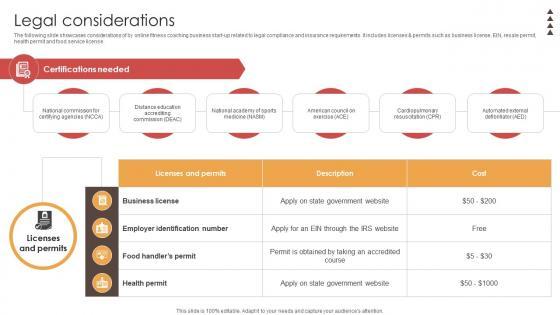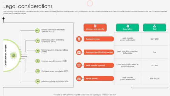 The following slide showcases considerations of by online fitness coaching business start-up related to legal compliance and insurance requirements. It includes licenses and permits such as business license, EIN, resale permit, health permit and food service license.Do you have to make sure that everyone on your team knows about any specific topic I yes, then you should give Legal Considerations Online Fitness Tutoring Business Market Entry Plan GTM SS V a try. Our experts have put a lot of knowledge and effort into creating this impeccable Legal Considerations Online Fitness Tutoring Business Market Entry Plan GTM SS V. You can use this template for your upcoming presentations, as the slides are perfect to represent even the tiniest detail. You can download these templates from the Slidegeeks website and these are easy to edit. So grab these today The following slide showcases considerations of by online fitness coaching business start-up related to legal compliance and insurance requirements. It includes licenses and permits such as business license, EIN, resale permit, health permit and food service license.