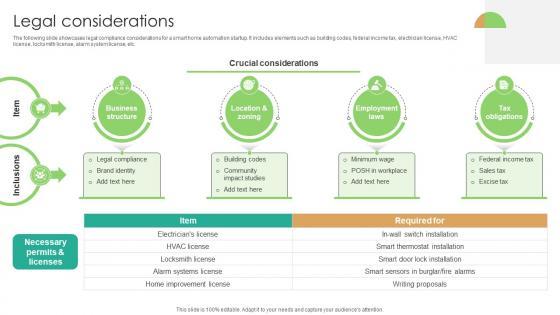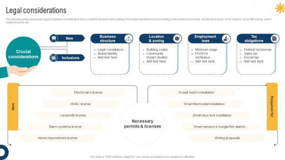 The following slide showcases legal compliance considerations for a smart home automation startup. It includes elements such as building codes, federal income tax, electrician license, HVAC license, locksmith license, alarm system license, etc.Do you have to make sure that everyone on your team knows about any specific topic I yes, then you should give Legal Considerations Smart Home Startup GTM Strategy GTM SS V a try. Our experts have put a lot of knowledge and effort into creating this impeccable Legal Considerations Smart Home Startup GTM Strategy GTM SS V. You can use this template for your upcoming presentations, as the slides are perfect to represent even the tiniest detail. You can download these templates from the Slidegeeks website and these are easy to edit. So grab these today The following slide showcases legal compliance considerations for a smart home automation startup. It includes elements such as building codes, federal income tax, electrician license, HVAC license, locksmith license, alarm system license, etc.