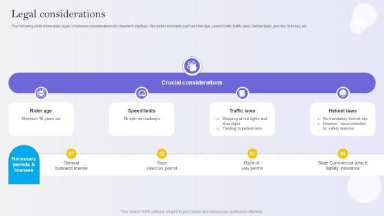 The following slide showcases legal compliance considerations for cleantech startups. It includes elements such as rider age, speed limits, traffic laws, helmet laws, permits, licenses, etc.There are so many reasons you need a Legal Considerations Electric Scooter Rental Go To Market Strategy GTM SS V. The first reason is you can not spend time making everything from scratch, Thus, Slidegeeks has made presentation templates for you too. You can easily download these templates from our website easily. The following slide showcases legal compliance considerations for cleantech startups. It includes elements such as rider age, speed limits, traffic laws, helmet laws, permits, licenses, etc.