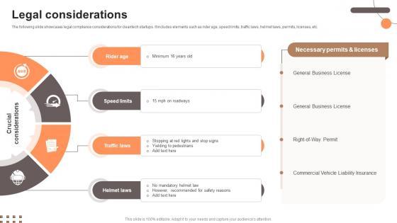 The following slide showcases legal compliance considerations for cleantech startups. It includes elements such as rider age, speed limits, traffic laws, helmet laws, permits, licenses, etc.If your project calls for a presentation, then Slidegeeks is your go-to partner because we have professionally designed, easy-to-edit templates that are perfect for any presentation. After downloading, you can easily edit Legal Considerations E Scooter Business Market Entry Strategy and make the changes accordingly. You can rearrange slides or fill them with different images. Check out all the handy templates The following slide showcases legal compliance considerations for cleantech startups. It includes elements such as rider age, speed limits, traffic laws, helmet laws, permits, licenses, etc.