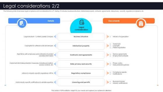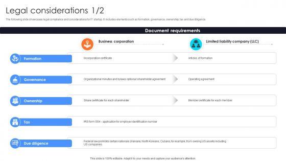 The following slide showcases legal compliance and considerations for IT startup. It includes elements such as formation, governance, ownership, tax and due diligence.If your project calls for a presentation, then Slidegeeks is your go-to partner because we have professionally designed, easy-to-edit templates that are perfect for any presentation. After downloading, you can easily edit Legal Considerations Information Technology Startup Go To Market Strategy GTM SS V and make the changes accordingly. You can rearrange slides or fill them with different images. Check out all the handy templates The following slide showcases legal compliance and considerations for IT startup. It includes elements such as formation, governance, ownership, tax and due diligence.