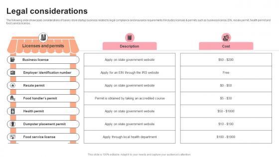 The following slide showcases considerations of bakery store startup business related to legal compliance and insurance requirements It includes licenses and permits such as business license, EIN, resale permit, health permit and food service license. Find highly impressive Legal Considerations Pastry Shop Market Entry Plan GTM SS V on Slidegeeks to deliver a meaningful presentation. You can save an ample amount of time using these presentation templates. No need to worry to prepare everything from scratch because Slidegeeks experts have already done a huge research and work for you. You need to download Legal Considerations Pastry Shop Market Entry Plan GTM SS V for your upcoming presentation. All the presentation templates are 100 percent editable and you can change the color and personalize the content accordingly. Download now The following slide showcases considerations of bakery store startup business related to legal compliance and insurance requirements It includes licenses and permits such as business license, EIN, resale permit, health permit and food service license.