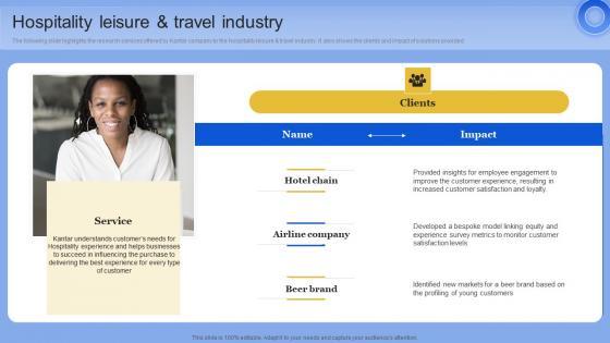 The following slide highlights the research services offered by Kantar company to the hospitality leisure and travel industry. It also shows the clients and impact of solutions provided From laying roadmaps to briefing everything in detail, our templates are perfect for you. You can set the stage with your presentation slides. All you have to do is download these easy to edit and customizable templates. Marketing Insights Company Profile Hospitality Leisure And Travel Industry Microsoft PDF will help you deliver an outstanding performance that everyone would remember and praise you for. Do download this presentation today.