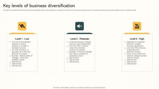 This slide showcases different levels of business diversification that can help organization to manage the market risk and increase business revenue. Three different levels for business diversification are low, moderate and high Welcome to our selection of the Key Levels Business Leveraging Horizontal Vertical Diversification Entering Professional Pdf. These are designed to help you showcase your creativity and bring your sphere to life. Planning and Innovation are essential for any business that is just starting out. This collection contains the designs that you need for your everyday presentations. All of our PowerPoints are 100 percent editable, so you can customize them to suit your needs. This multi purpose template can be used in various situations. Grab these presentation templates today This slide showcases different levels of business diversification that can help organization to manage the market risk and increase business revenue. Three different levels for business diversification are low, moderate and high
