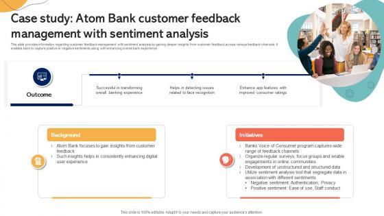 This slide provides information regarding customer feedback management with sentiment analysis by gaining deeper insights from customer feedback across various feedback channels. It enables bank to capture positive or negative sentiments along with enhancing overall bank experience. Do you have to make sure that everyone on your team knows about any specific topic I yes, then you should give Case Study Atom Bank Customer Feedback Management Emotionally Intelligent Insights Leveraging AI SS V a try. Our experts have put a lot of knowledge and effort into creating this impeccable Case Study Atom Bank Customer Feedback Management Emotionally Intelligent Insights Leveraging AI SS V. You can use this template for your upcoming presentations, as the slides are perfect to represent even the tiniest detail. You can download these templates from the Slidegeeks website and these are easy to edit. So grab these today This slide provides information regarding customer feedback management with sentiment analysis by gaining deeper insights from customer feedback across various feedback channels. It enables bank to capture positive or negative sentiments along with enhancing overall bank experience.