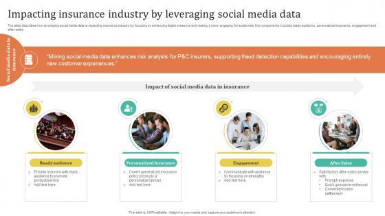 The slide describes how leveraging social media data is impacting insurance industry by focusing on enhancing digital presence and making it more engaging for audiences. Key components includes ready audience, personalized insurance, engagement and after sales. The Improving Customer Satisfaction Impacting Insurance Industry By Leveraging Social is a compilation of the most recent design trends as a series of slides. It is suitable for any subject or industry presentation, containing attractive visuals and photo spots for businesses to clearly express their messages. This template contains a variety of slides for the user to input data, such as structures to contrast two elements, bullet points, and slides for written information. Slidegeeks is prepared to create an impression. The slide describes how leveraging social media data is impacting insurance industry by focusing on enhancing digital presence and making it more engaging for audiences. Key components includes ready audience, personalized insurance, engagement and after sales.