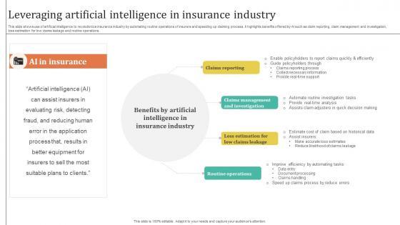 This slide shows use of artificial intelligence to revolutionize insurance industry by automating routine operations of insurers and speeding up claiming process. It highlights benefits offered by AI such as claim reporting, claim management and investigation, loss estimation for low claims leakage and routine operations. Want to ace your presentation in front of a live audience Our Improving Customer Satisfaction Leveraging Artificial Intelligence In Insurance Industry can help you do that by engaging all the users towards you. Slidegeeks experts have put their efforts and expertise into creating these impeccable powerpoint presentations so that you can communicate your ideas clearly. Moreover, all the templates are customizable, and easy-to-edit and downloadable. Use these for both personal and commercial use. This slide shows use of artificial intelligence to revolutionize insurance industry by automating routine operations of insurers and speeding up claiming process. It highlights benefits offered by AI such as claim reporting, claim management and investigation, loss estimation for low claims leakage and routine operations.