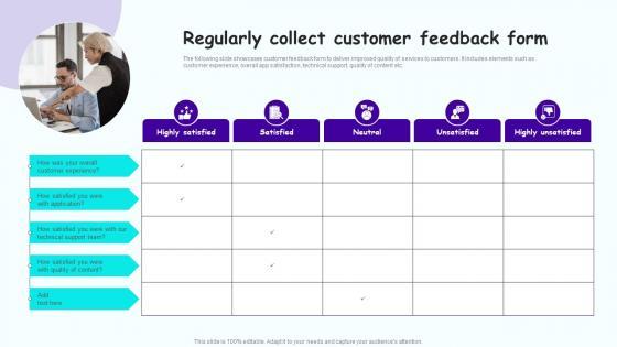 The following slide showcases customer feedback form to deliver improved quality of services to customers. It includes elements such as customer experience, overall app satisfaction, technical support, quality of content etc. Do you know about Slidesgeeks Regularly Collect Customer Leveraging Mobile Marketing Strategies Infographics Pdf These are perfect for delivering any kind od presentation. Using it, create PowerPoint presentations that communicate your ideas and engage audiences. Save time and effort by using our pre designed presentation templates that are perfect for a wide range of topic. Our vast selection of designs covers a range of styles, from creative to business, and are all highly customizable and easy to edit. Download as a PowerPoint template or use them as Google Slides themes. The following slide showcases customer feedback form to deliver improved quality of services to customers. It includes elements such as customer experience, overall app satisfaction, technical support, quality of content etc.