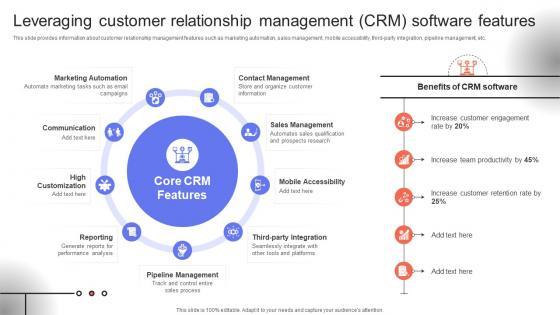 This slide provides information about customer relationship management features such as marketing automation, sales management, mobile accessibility, third-party integration, pipeline management, etc. Slidegeeks has constructed Elevating Sales Networks Leveraging Customer Relationship Management CRM SA SS V after conducting extensive research and examination. These presentation templates are constantly being generated and modified based on user preferences and critiques from editors. Here, you will find the most attractive templates for a range of purposes while taking into account ratings and remarks from users regarding the content. This is an excellent jumping-off point to explore our content and will give new users an insight into our top-notch PowerPoint Templates. This slide provides information about customer relationship management features such as marketing automation, sales management, mobile accessibility, third-party integration, pipeline management, etc.