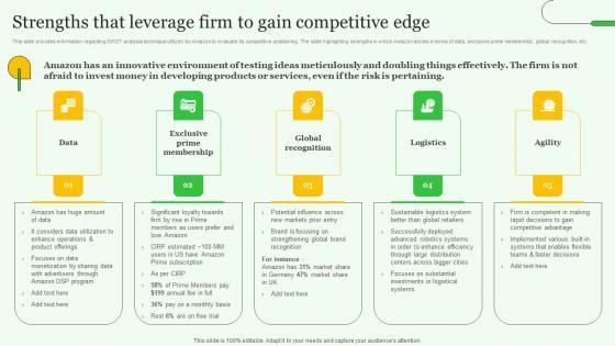 This slide provides information regarding SWOT analysis technique utilized by Amazon to evaluate its competitive positioning. The slide highlighting strengths in which Amazon excels in terms of data, exclusive prime membership, global recognition, etc. Whether you have daily or monthly meetings, a brilliant presentation is necessary. Strengths That Leverage Firm Exploring Amazons Global Business Model Growth Sample Pdf can be your best option for delivering a presentation. Represent everything in detail using Strengths That Leverage Firm Exploring Amazons Global Business Model Growth Sample Pdf and make yourself stand out in meetings. The template is versatile and follows a structure that will cater to your requirements. All the templates prepared by Slidegeeks are easy to download and edit. Our research experts have taken care of the corporate themes as well. So, give it a try and see the results. This slide provides information regarding SWOT analysis technique utilized by Amazon to evaluate its competitive positioning. The slide highlighting strengths in which Amazon excels in terms of data, exclusive prime membership, global recognition, etc.