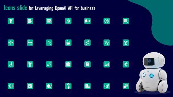 Introducing our well designed Icons Slide For Leveraging Openai API For Business Summary PDF set of slides. The slide displays editable icons to enhance your visual presentation. The icons can be edited easily. So customize according to your business to achieve a creative edge. Download and share it with your audience.