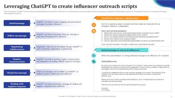 This showcases ChatGPT use cases for formulating influencer outreach scripts. Its key components are initial message, follow-up message, negotiating collaborations, regular communication, thank you message and dealing with negative response. Boost your pitch with our creative ChatGpt Comprehensive Guide Leveraging ChatGpt To Create Influencer Ppt Powerpoint ChatGpt SS V. Deliver an awe-inspiring pitch that will mesmerize everyone. Using these presentation templates you will surely catch everyones attention. You can browse the ppts collection on our website. We have researchers who are experts at creating the right content for the templates. So you do not have to invest time in any additional work. Just grab the template now and use them. This showcases ChatGPT use cases for formulating influencer outreach scripts. Its key components are initial message, follow-up message, negotiating collaborations, regular communication, thank you message and dealing with negative response.