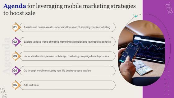 Find a pre-designed and impeccable Agenda For Leveraging Mobile Marketing Strategies To Boost Sale Diagrams Pdf. The templates can ace your presentation without additional effort. You can download these easy-to-edit presentation templates to make your presentation stand out from others. So, what are you waiting for Download the template from Slidegeeks today and give a unique touch to your presentation. Our Agenda For Leveraging Mobile Marketing Strategies To Boost Sale Diagrams Pdf are topically designed to provide an attractive backdrop to any subject. Use them to look like a presentation pro.