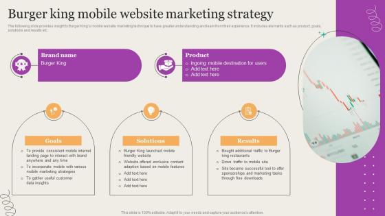 The following slide provides insight to Burger Kings mobile website marketing technique to have greater understanding and learn from their experience. It includes elements such as product, goals, solutions and results etc. Want to ace your presentation in front of a live audience Our Leveraging Mobile Marketing Strategies Burger King Mobile Website Marketing Strategy Mockup Pdf can help you do that by engaging all the users towards you. Slidegeeks experts have put their efforts and expertise into creating these impeccable powerpoint presentations so that you can communicate your ideas clearly. Moreover, all the templates are customizable, and easy-to-edit and downloadable. Use these for both personal and commercial use. The following slide provides insight to Burger Kings mobile website marketing technique to have greater understanding and learn from their experience. It includes elements such as product, goals, solutions and results etc.