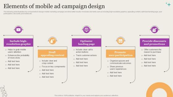 The following slide illustrates key components to design mobile marketing campaign and drive better results. It includes elements such as including high resolution graphics, appealing content, optimized landing page, user participation, discounts, promotions etc. From laying roadmaps to briefing everything in detail, our templates are perfect for you. You can set the stage with your presentation slides. All you have to do is download these easy-to-edit and customizable templates. Leveraging Mobile Marketing Strategies Elements Of Mobile Ad Campaign Design Themes Pdf will help you deliver an outstanding performance that everyone would remember and praise you for. Do download this presentation today. The following slide illustrates key components to design mobile marketing campaign and drive better results. It includes elements such as including high resolution graphics, appealing content, optimized landing page, user participation, discounts, promotions etc.