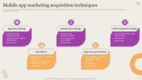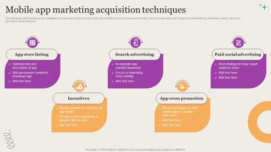 The following slide illustrates some strategies to a cquire new customers for mobile app marketing and increase download rate. It includes elements such as paid social advertising, incentives, search, app cross promotion, store listing etc. Make sure to capture your audiences attention in your business displays with our gratis customizable Leveraging Mobile Marketing Strategies Mobile App Marketing Acquisition Techniques Brochure Pdf. These are great for business strategies, office conferences, capital raising or task suggestions. If you desire to acquire more customers for your tech business and ensure they stay satisfied, create your own sales presentation with these plain slides. The following slide illustrates some strategies to a cquire new customers for mobile app marketing and increase download rate. It includes elements such as paid social advertising, incentives, search, app cross promotion, store listing etc.