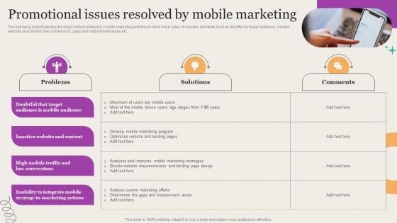 The following slide illustrates the major problems fixed by mobile marketing activities to drive more sales. It includes elements such as doubtful for target audience, inactive website and content, low conversions, gaps and improvement areas etc. Here you can discover an assortment of the finest PowerPoint and Google Slides templates. With these templates, you can create presentations for a variety of purposes while simultaneously providing your audience with an eye-catching visual experience. Download Leveraging Mobile Marketing Strategies Promotional Issues Resolved By Mobile Marketing Introduction Pdf to deliver an impeccable presentation. These templates will make your job of preparing presentations much quicker, yet still, maintain a high level of quality. Slidegeeks has experienced researchers who prepare these templates and write high-quality content for you. Later on, you can personalize the content by editing the Leveraging Mobile Marketing Strategies Promotional Issues Resolved By Mobile Marketing Introduction Pdf. The following slide illustrates the major problems fixed by mobile marketing activities to drive more sales. It includes elements such as doubtful for target audience, inactive website and content, low conversions, gaps and improvement areas etc.