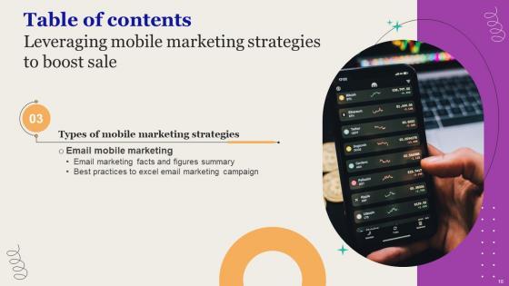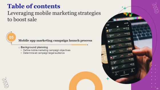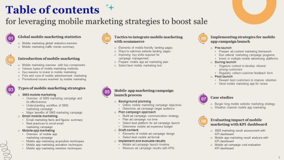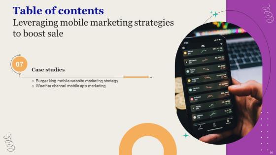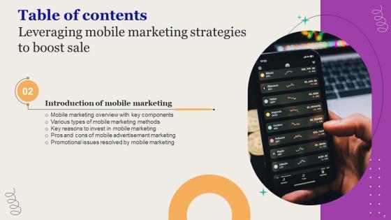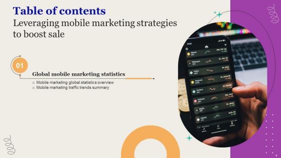 Do you have an important presentation coming up Are you looking for something that will make your presentation stand out from the rest Look no further than Table Of Contents For Leveraging Mobile Marketing Strategies Themes Pdf. With our professional designs, you can trust that your presentation will pop and make delivering it a smooth process. And with Slidegeeks, you can trust that your presentation will be unique and memorable. So why wait Grab Table Of Contents For Leveraging Mobile Marketing Strategies To Boost Sale Themes Pdf today and make your presentation stand out from the rest. Our Table Of Contents For Leveraging Mobile Marketing Strategies Themes Pdf are topically designed to provide an attractive backdrop to any subject. Use them to look like a presentation pro.