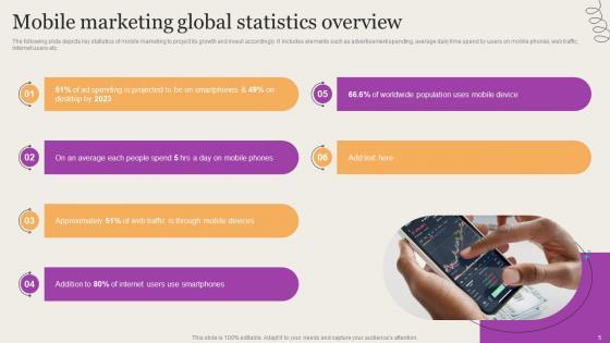 The following slide depicts key statistics of mobile marketing to project its growth and invest accordingly. It includes elements such as advertisement spending, average daily time spend by users on mobile phones, web traffic, internet users etc. This Leveraging Mobile Marketing Strategies Mobile Marketing Global Statistics Overview Infographics Pdf is perfect for any presentation, be it in front of clients or colleagues. It is a versatile and stylish solution for organizing your meetings. The Leveraging Mobile Marketing Strategies Mobile Marketing Global Statistics Overview Infographics Pdf features a modern design for your presentation meetings. The adjustable and customizable slides provide unlimited possibilities for acing up your presentation. Slidegeeks has done all the homework before launching the product for you. So, do not wait, grab the presentation templates today The following slide depicts key statistics of mobile marketing to project its growth and invest accordingly. It includes elements such as advertisement spending, average daily time spend by users on mobile phones, web traffic, internet users etc.