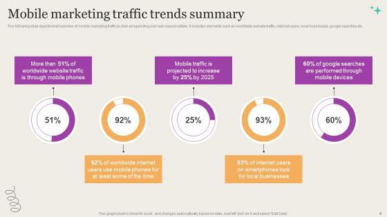 The following slide depicts brief overview of mobile marketing traffic to plan ad spending over web based outlets. It includes elements such as worldwide website traffic, internet users, local businesses, google searches etc. Explore a selection of the finest Leveraging Mobile Marketing Strategies Mobile Marketing Traffic Trends Summary Diagrams Pdf here. With a plethora of professionally designed and pre-made slide templates, you can quickly and easily find the right one for your upcoming presentation. You can use our Leveraging Mobile Marketing Strategies Mobile Marketing Traffic Trends Summary Diagrams Pdf to effectively convey your message to a wider audience. Slidegeeks has done a lot of research before preparing these presentation templates. The content can be personalized and the slides are highly editable. Grab templates today from Slidegeeks. The following slide depicts brief overview of mobile marketing traffic to plan ad spending over web based outlets. It includes elements such as worldwide website traffic, internet users, local businesses, google searches etc.