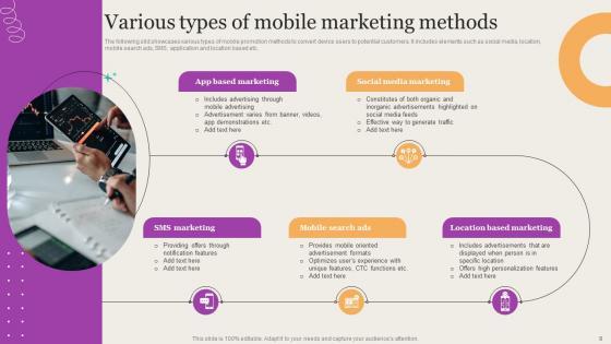 The following slid showcases various types of mobile promotion methods to convert device users to potential customers. It includes elements such as social media, location, mobile search ads, SMS, application and location based etc. From laying roadmaps to briefing everything in detail, our templates are perfect for you. You can set the stage with your presentation slides. All you have to do is download these easy-to-edit and customizable templates. Leveraging Mobile Marketing Strategies Various Types Of Mobile Marketing Methods Rules Pdf will help you deliver an outstanding performance that everyone would remember and praise you for. Do download this presentation today. The following slid showcases various types of mobile promotion methods to convert device users to potential customers. It includes elements such as social media, location, mobile search ads, SMS, application and location based etc.
