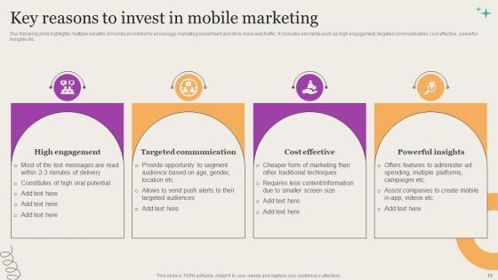The following slide highlights multiple benefits of mobile promotion to encourage marketing investment and drive more web traffic. It includes elements such as high engagement, targeted communication, cost effective, powerful insights etc. Find highly impressive Leveraging Mobile Marketing Strategies Key Reasons To Invest In Mobile Marketing Template Pdf on Slidegeeks to deliver a meaningful presentation. You can save an ample amount of time using these presentation templates. No need to worry to prepare everything from scratch because Slidegeeks experts have already done a huge research and work for you. You need to download Leveraging Mobile Marketing Strategies Key Reasons To Invest In Mobile Marketing Template Pdf for your upcoming presentation. All the presentation templates are 100 percent editable and you can change the color and personalize the content accordingly. Download now. The following slide highlights multiple benefits of mobile promotion to encourage marketing investment and drive more web traffic. It includes elements such as high engagement, targeted communication, cost effective, powerful insights etc.