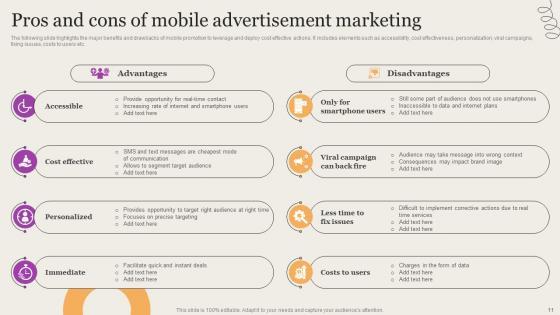 The following slide highlights the major benefits and drawbacks of mobile promotion to leverage and deploy cost effective actions. It includes elements such as accessibility, cost effectiveness, personalization, viral campaigns, fixing issues, costs to users etc. This Leveraging Mobile Marketing Strategies Pros And Cons Of Mobile Advertisement Demonstration Pdf from Slidegeeks makes it easy to present information on your topic with precision. It provides customization options, so you can make changes to the colors, design, graphics, or any other component to create a unique layout. It is also available for immediate download, so you can begin using it right away. Slidegeeks has done good research to ensure that you have everything you need to make your presentation stand out. Make a name out there for a brilliant performance. The following slide highlights the major benefits and drawbacks of mobile promotion to leverage and deploy cost effective actions. It includes elements such as accessibility, cost effectiveness, personalization, viral campaigns, fixing issues, costs to users etc.