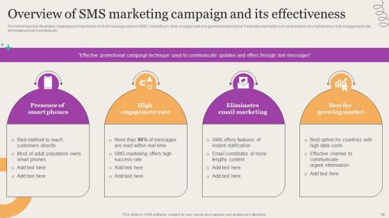 The following slide illustrates meaning and importance of short message service SMS marketing to drive engagement and grow business online. It includes elements such as presence of smart phones, high engagement rate, eliminates email marketing etc. Are you searching for a Leveraging Mobile Marketing Strategies Overview Of Sms Marketing Campaign Pictures Pdf that is uncluttered, straightforward, and original It is easy to edit, and you can change the colors to suit your personal or business branding. For a presentation that expresses how much effort you have put in, this template is ideal With all of its features, including tables, diagrams, statistics, and lists, it is perfect for a business plan presentation. Make your ideas more appealing with these professional slides. Download Leveraging Mobile Marketing Strategies Overview Of Sms Marketing Campaign Pictures Pdf from Slidegeeks today. The following slide illustrates meaning and importance of short message service SMS marketing to drive engagement and grow business online. It includes elements such as presence of smart phones, high engagement rate, eliminates email marketing etc.