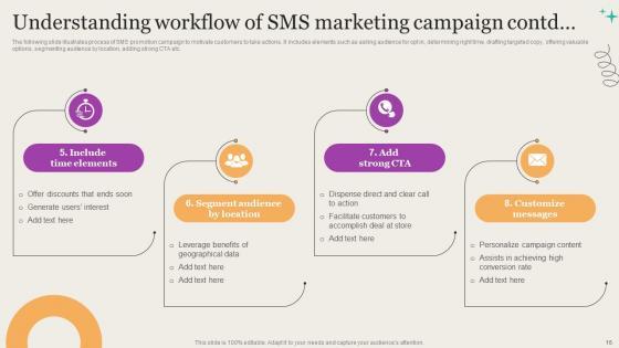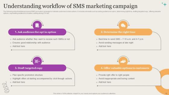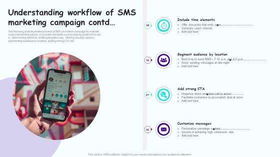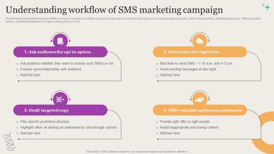 The following slide illustrates process of SMS promotion campaign to motivate customers to take actions. It includes elements such as asking audience for opt in, determining right time, drafting targeted copy, offering valuable options, segmenting audience by location, adding strong CTA etc. From laying roadmaps to briefing everything in detail, our templates are perfect for you. You can set the stage with your presentation slides. All you have to do is download these easy to edit and customizable templates. Understanding Workflow Of Leveraging Mobile Marketing Strategies Professional Pdf will help you deliver an outstanding performance that everyone would remember and praise you for. Do download this presentation today. The following slide illustrates process of SMS promotion campaign to motivate customers to take actions. It includes elements such as asking audience for opt in, determining right time, drafting targeted copy, offering valuable options, segmenting audience by location, adding strong CTA etc.