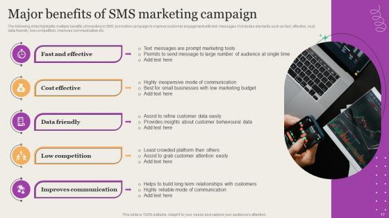 The following slide highlights multiple benefits of investing in SMS promotion campaign to improve customer engagement with text messages. It includes elements such as fast, effective, cost, data friendly, low competition, improves communication etc. If your project calls for a presentation, then Slidegeeks is your go-to partner because we have professionally designed, easy-to-edit templates that are perfect for any presentation. After downloading, you can easily edit Leveraging Mobile Marketing Strategies Major Benefits Of Sms Marketing Campaign Professional Pdf and make the changes accordingly. You can rearrange slides or fill them with different images. Check out all the handy templates The following slide highlights multiple benefits of investing in SMS promotion campaign to improve customer engagement with text messages. It includes elements such as fast, effective, cost, data friendly, low competition, improves communication etc.