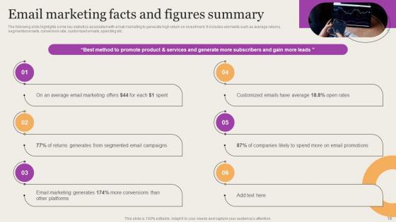 The following slide highlights some key statistics associated with email marketing to generate high return on investment. It includes elements such as average returns, segmented emails, conversion rate, customized emails, spending etc. Slidegeeks is here to make your presentations a breeze with Leveraging Mobile Marketing Strategies Email Marketing Facts And Figures Summary Background Pdf With our easy-to-use and customizable templates, you can focus on delivering your ideas rather than worrying about formatting. With a variety of designs to choose from, you are sure to find one that suits your needs. And with animations and unique photos, illustrations, and fonts, you can make your presentation pop. So whether you are giving a sales pitch or presenting to the board, make sure to check out Slidegeeks first. The following slide highlights some key statistics associated with email marketing to generate high return on investment. It includes elements such as average returns, segmented emails, conversion rate, customized emails, spending etc.