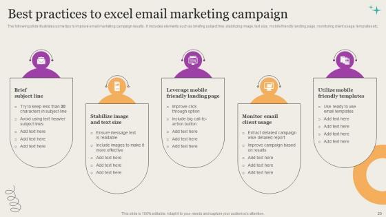 The following slide illustrates some tips to improve email marketing campaign results . It includes elements such as briefing subject line, stabilizing image, text size, mobile friendly landing page, monitoring client usage, templates etc. Create an editable Leveraging Mobile Marketing Strategies Best Practices To Excel Email Marketing Topics Pdf that communicates your idea and engages your audience. Whether you are presenting a business or an educational presentation, pre-designed presentation templates help save time. Leveraging Mobile Marketing Strategies Best Practices To Excel Email Marketing Topics Pdf is highly customizable and very easy to edit, covering many different styles from creative to business presentations. Slidegeeks has creative team members who have crafted amazing templates. So, go and get them without any delay. The following slide illustrates some tips to improve email marketing campaign results . It includes elements such as briefing subject line, stabilizing image, text size, mobile friendly landing page, monitoring client usage, templates etc.